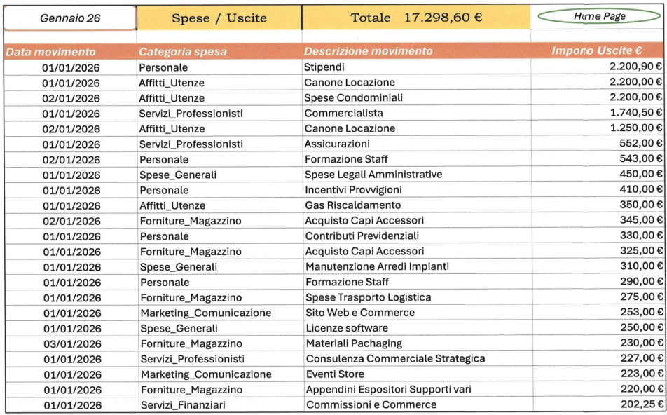 Scopri come il file organizza entrate, uscite e bilanci in modo visivo e intuitivo, permettendoti di comprendere rapidamente l’andamento economico del tuo negozio.