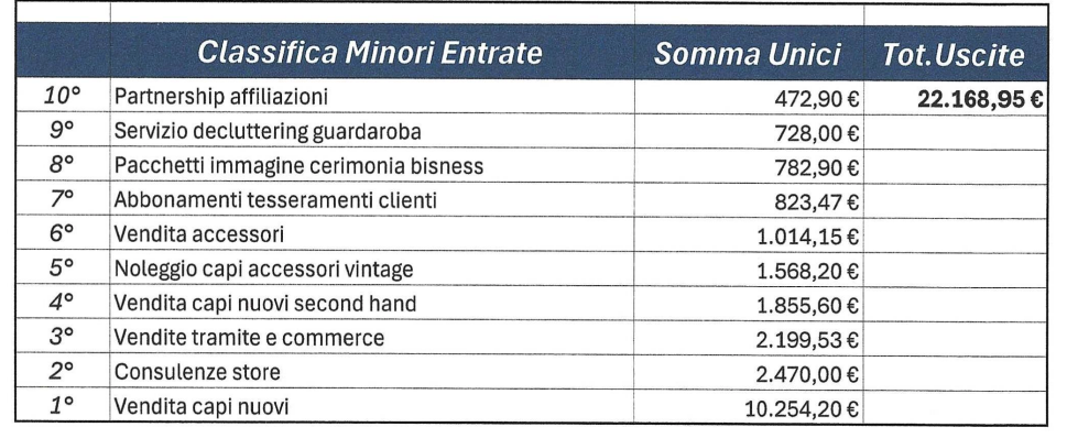 In questa sezione vengono raccolti e analizzati tutti i dati relativi alle entrate del negozio suddivise per tipologia di prodotto. La slide permette di monitorare l’andamento dei ricavi e di identificare le fonti principali di guadagno