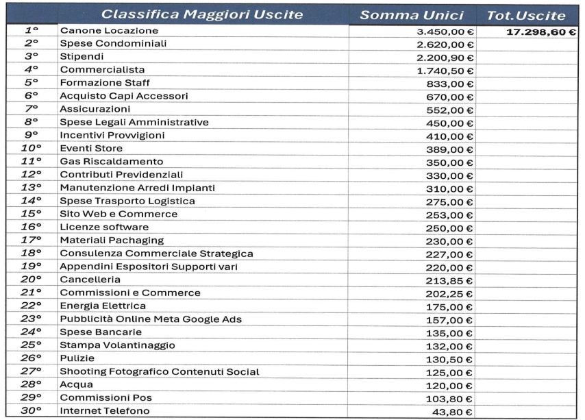 La slide mostra le voci in cui le uscite sono state particolarmente elevate, aiutando a individuare le voci di spesa che hanno inciso maggiormente sul bilancio e a valutare possibili interventi di riduzione dei costi