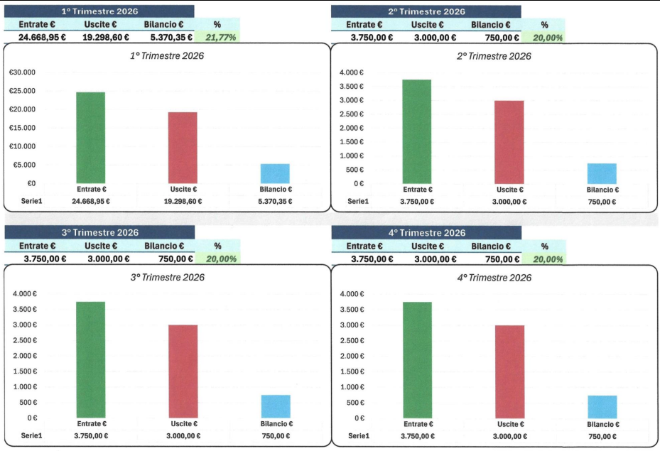 La slide riassume i dati economici suddivisi per trimestre, permettendo di confrontare le performance dei diversi periodi dell’anno e di individuare trend stagionali o ricorrenze significative.